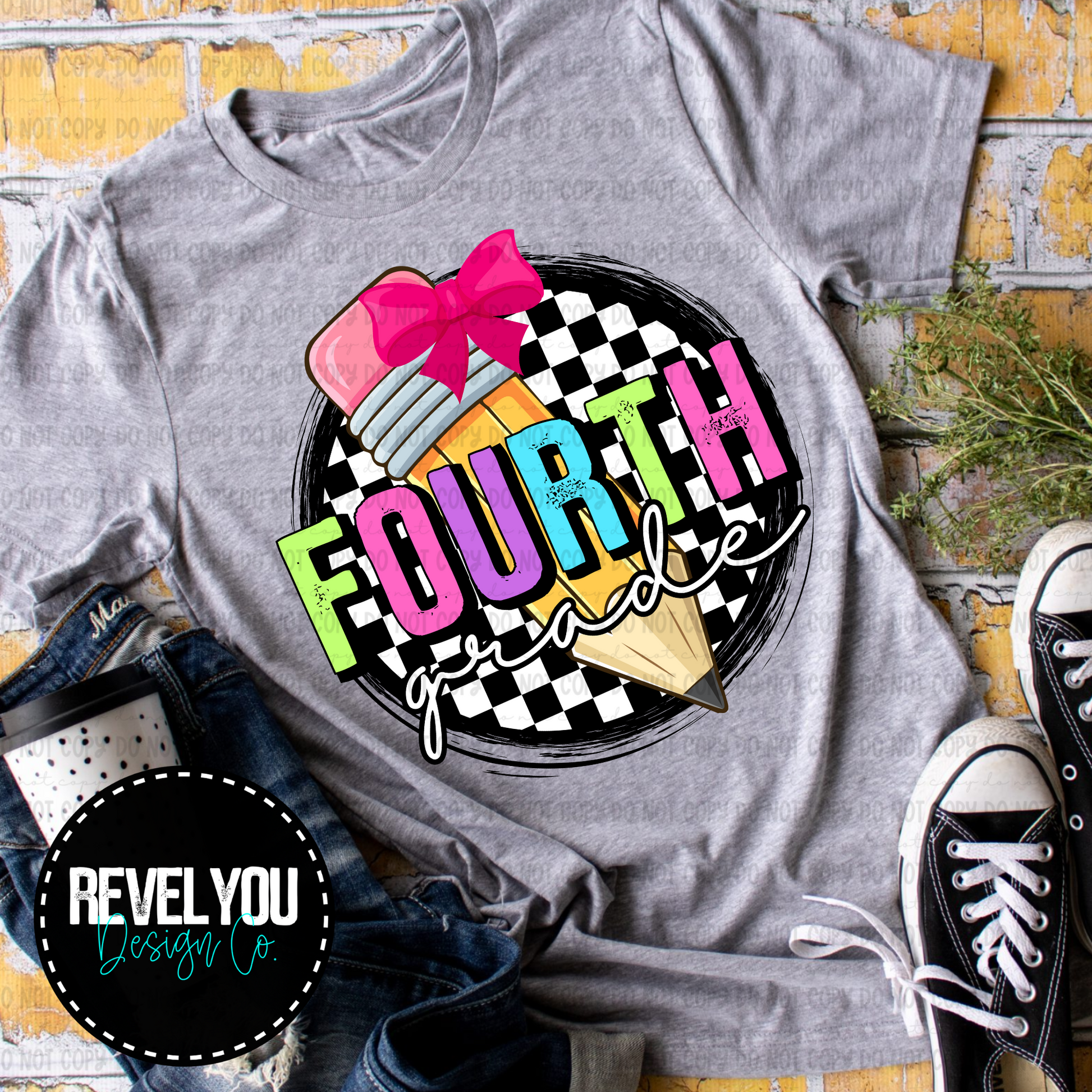 Checkered Circle Pencil Bow Fourth Grade - PNG