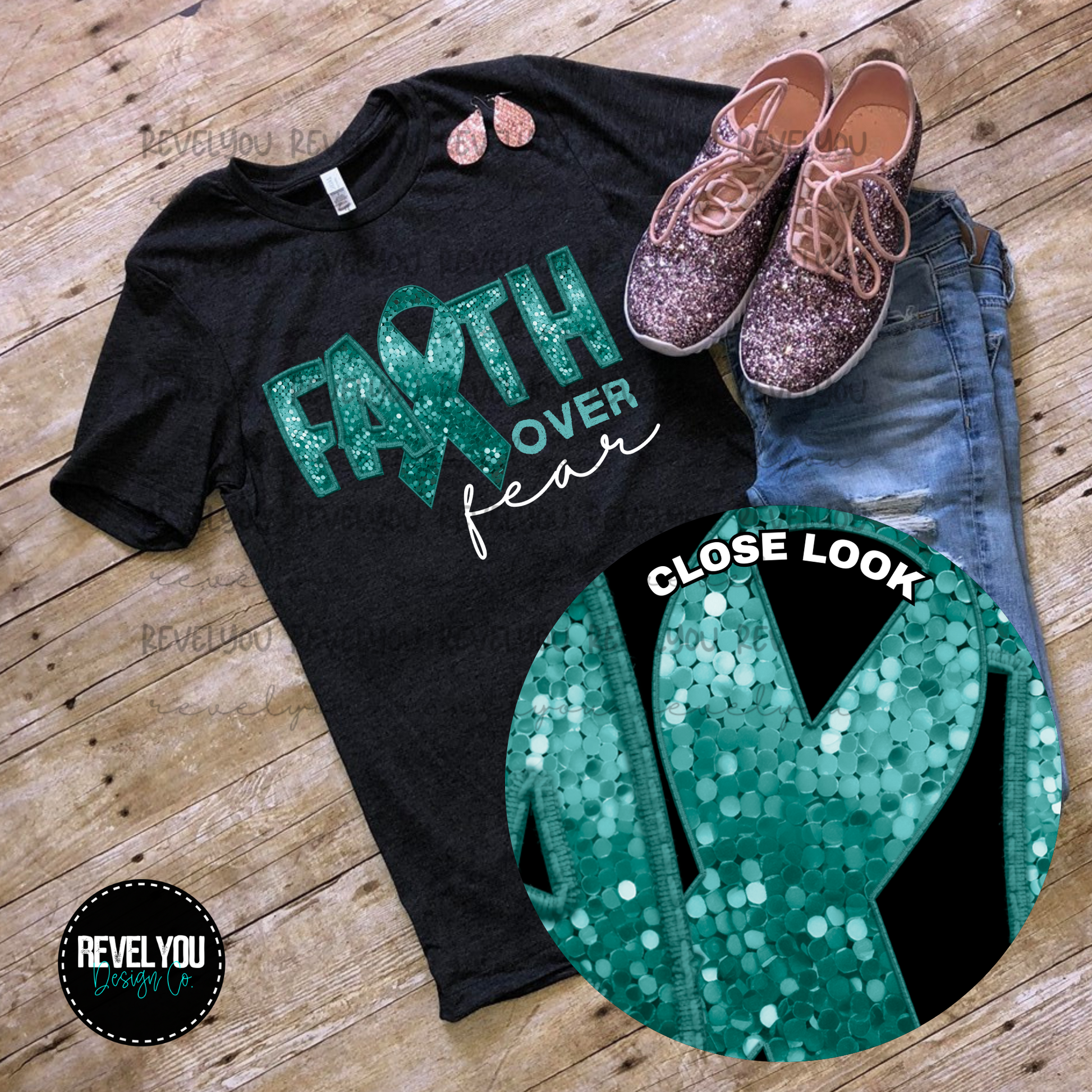 Teal Faith Over Fear Faux Embroidery Sequin Look - PNG